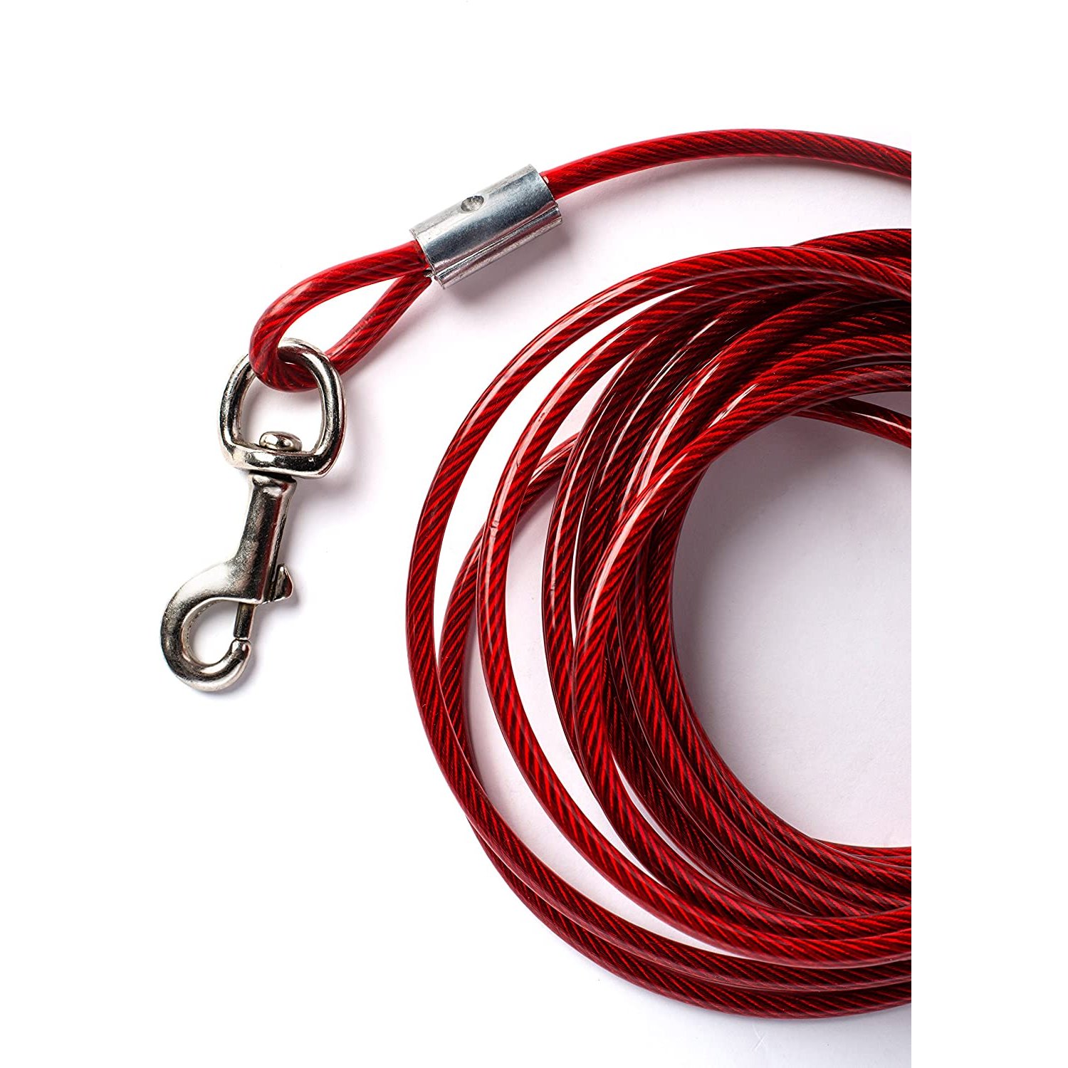 Prevue Pet Products medium-duty 30Æ tie-out cable 2121 is designed for dogs up to 65 lbs. Medium duty, galvanized aircraft-grade wound-steel cable is housed within crack-resistant, high visibility Red vinyl casing to ensure your dog stays safe and secure. Premium quality die-cast iron swivel bolt snaps at both ends to connect easily. Medium duty tie out cable is 30 foot long with a 3.3 mm diameter wire cable; 4.8 mm in vinyl casing.