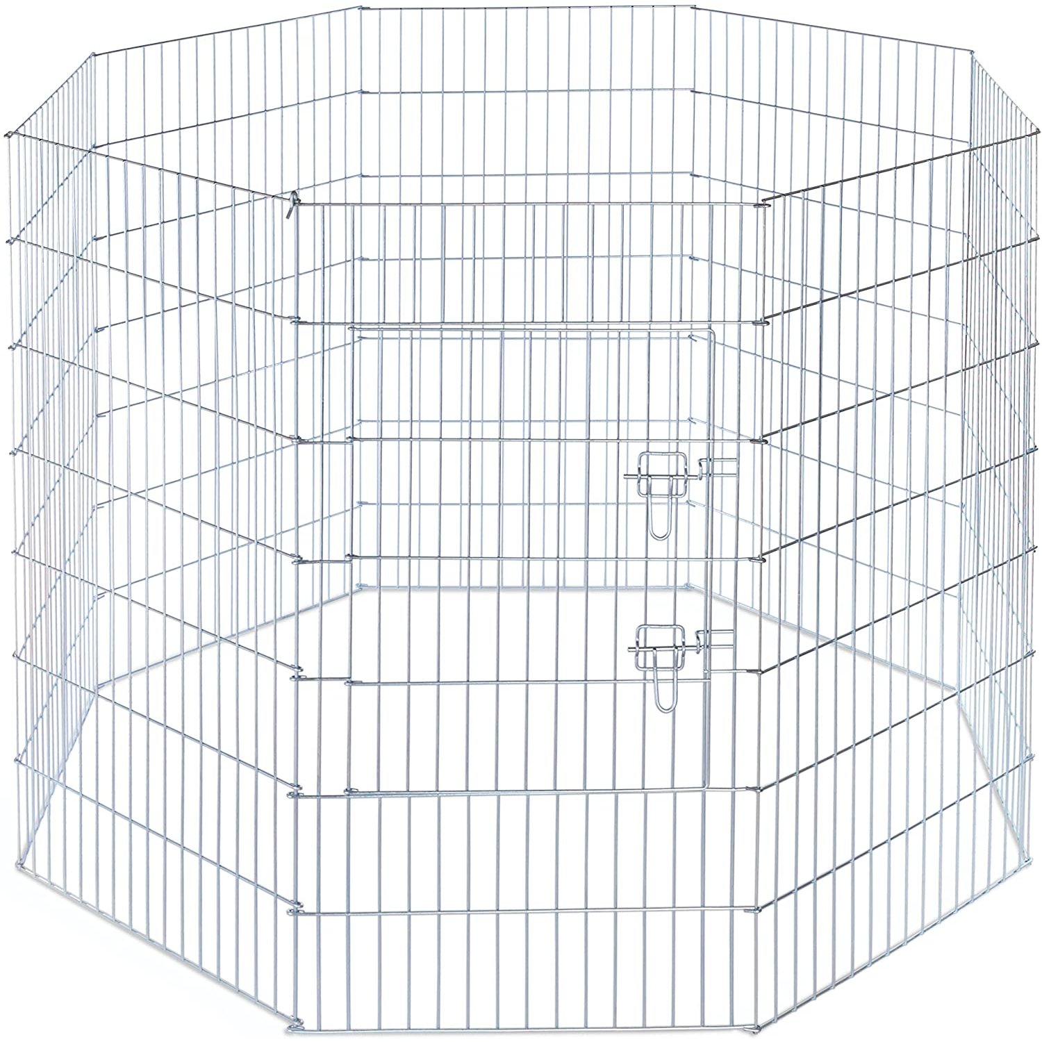 Prevue Pet Products Exercise Pen for Dogs 40142 is heavy duty and assembles easily, no tools required! 8 panel exercise pen features rust-resistant Bright Zinc finish over solid steel rods and includes grounding stakes. Ideal for small and medium sized dogs, each panel measures 24ÆÆ Wide and 42ÆÆ High. Front access door has 2 secure latches and measures 18 1/4" Wide and 23 1/4" High. Exercise Pen folds flat for storage or travel and measures approximately 57ÆÆ in diameter when assembled. To set it up simply take it out of the box, make sure the door is in the lower registry of the main panel, slide the connector pin (4 1/2" L) through the connection loops and it's good to go. Additionally, the 4 grounding stakes can be used to secure exercise pen into soil.