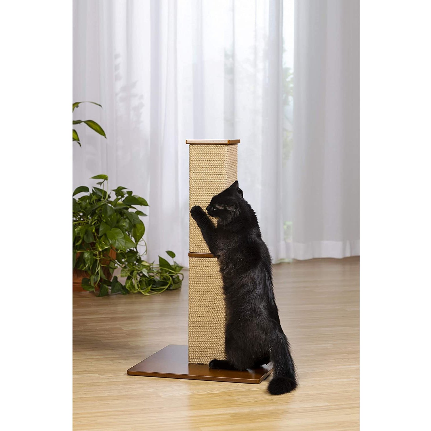 Prevue Pet Gemini Tall Square Scratching Post provides a dedicated place for scratching and stretching, alleviating destructive behavior to household objects. At 32" tall your cat gets a full vertical stretch and healthy exercise while keeping nails groomed and paws strong. Handsomely finished base, post divider and cap provide a furniture feel to complement the durable jute wrapped post and integrate with your room décor. One unique feature of the Gemini is the two-piece post. Top and bottom pieces are identical and interchangeable, this exclusive design means as one half gets worn, you simply disassemble the unit, swap positions of the worn post with the lesser worn post and reassemble. You’ll get twice the life out of your scratching post! Our Gemini Tall Square Scratcher assembles easily with included hardware and will last for years to come. Sturdy base measures 19’’ by 19’’ square, post measures 5 ½’’ on each side, with a total of height of 32’’ for a full power workout.