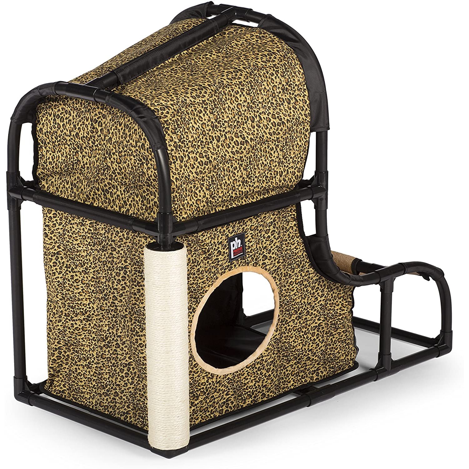 • Two hideaways – an elevated nook with dangling puff ball toy and plush mat plus a more secluded, lower hideaway