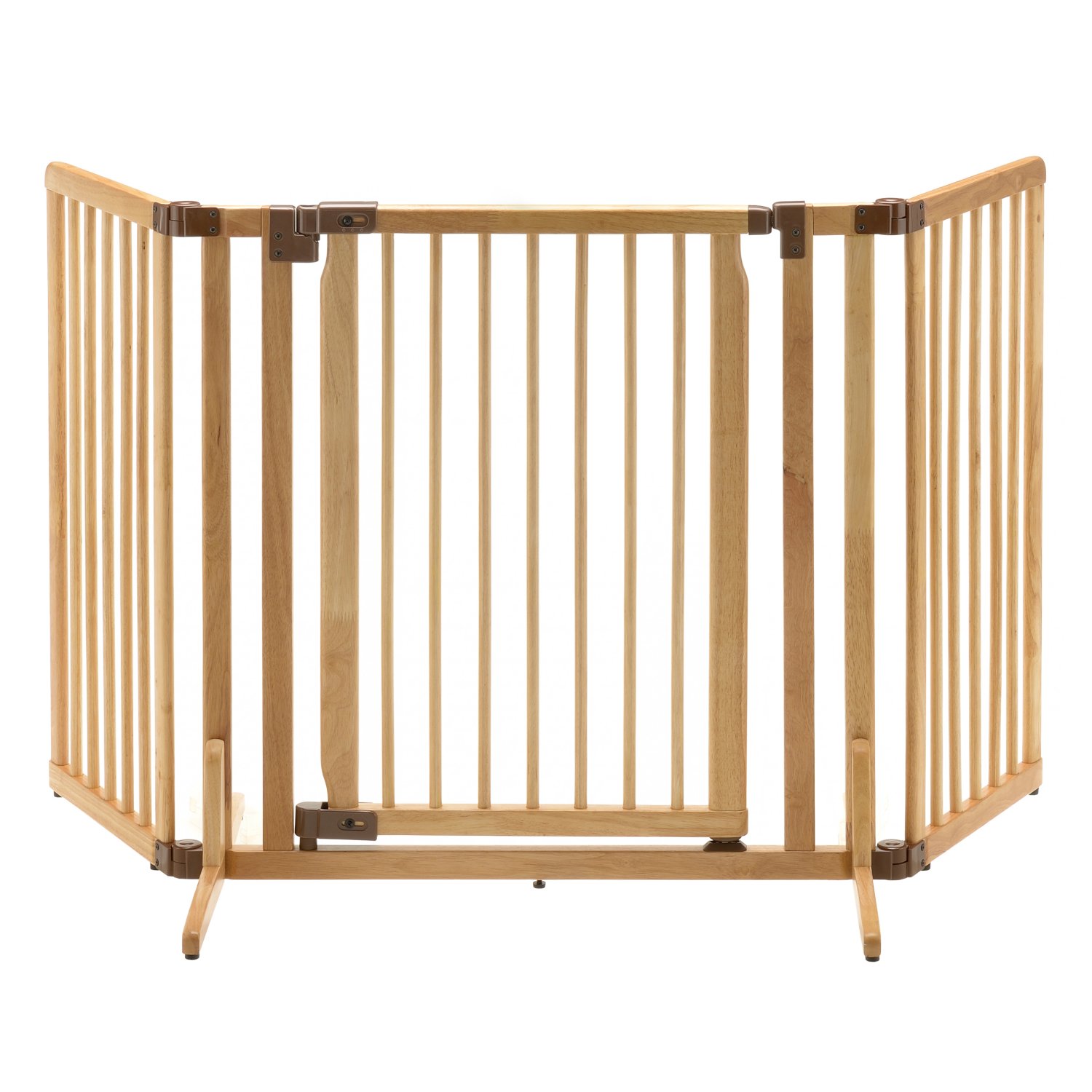 Expertly crafted with a beautiful natural wood design, the Wooden Premium Plus Freestanding Pet Gate is entirely made of wood and fits doorway and hallway openings from 33.5” to 63” wide! Plus, the specially designed walk-thru door opens in both directions and includes an upper/lower locking system to allow free movement and extra security! But the best bonus yet is the specially designed side panels adjust in increments of 10 degrees to allow you more options for use in your home! Simply adjust the gate to fit your personal needs.